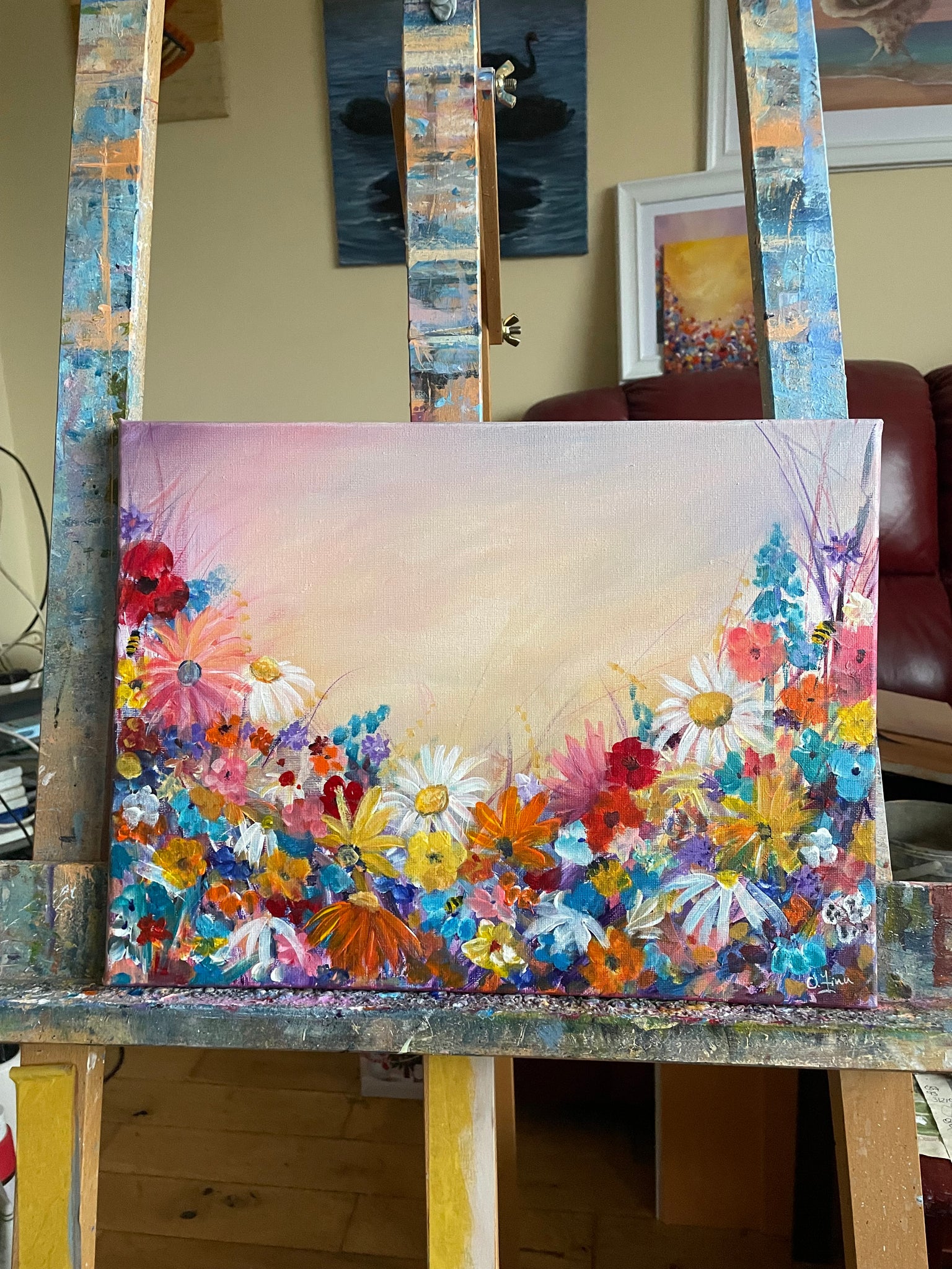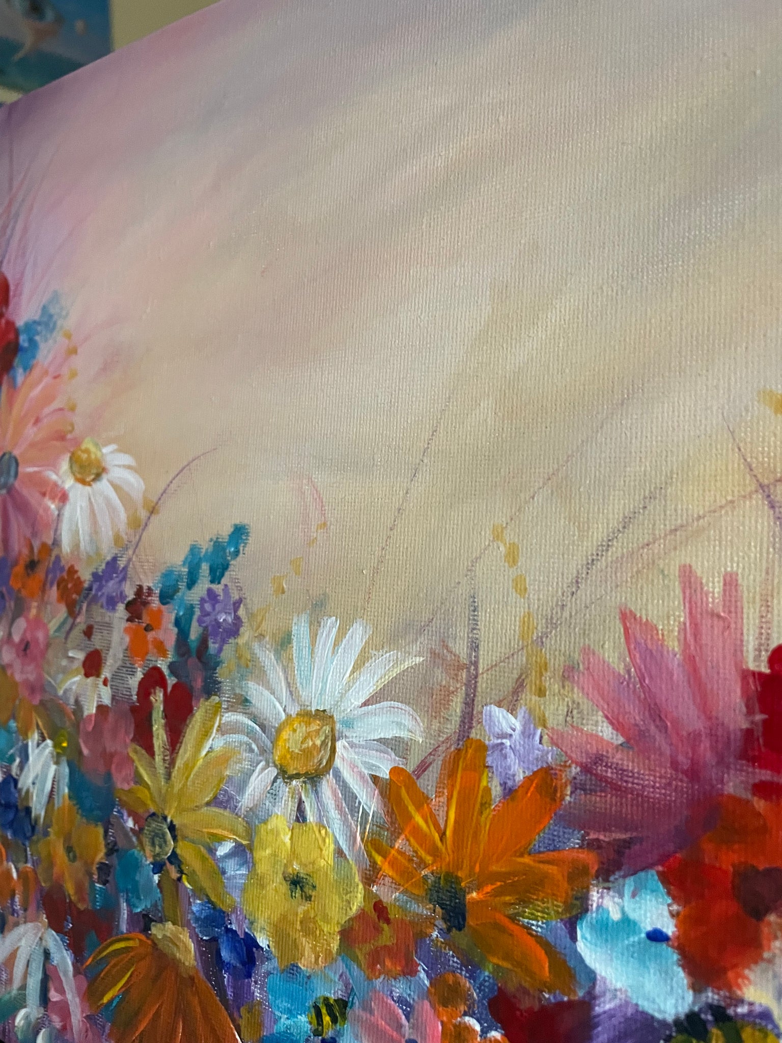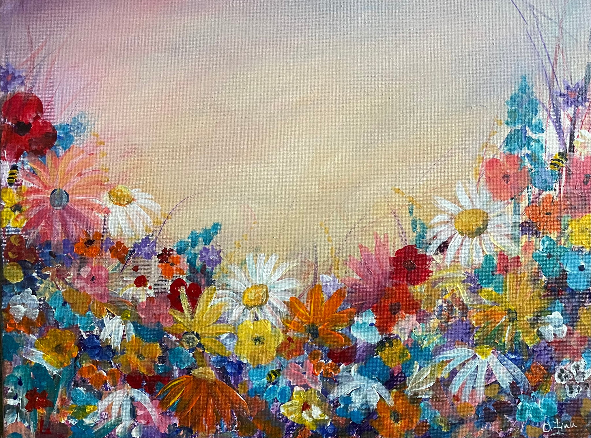 Contemporary abstract art of a multicolour meadow with flowers. Painted in January 2026.